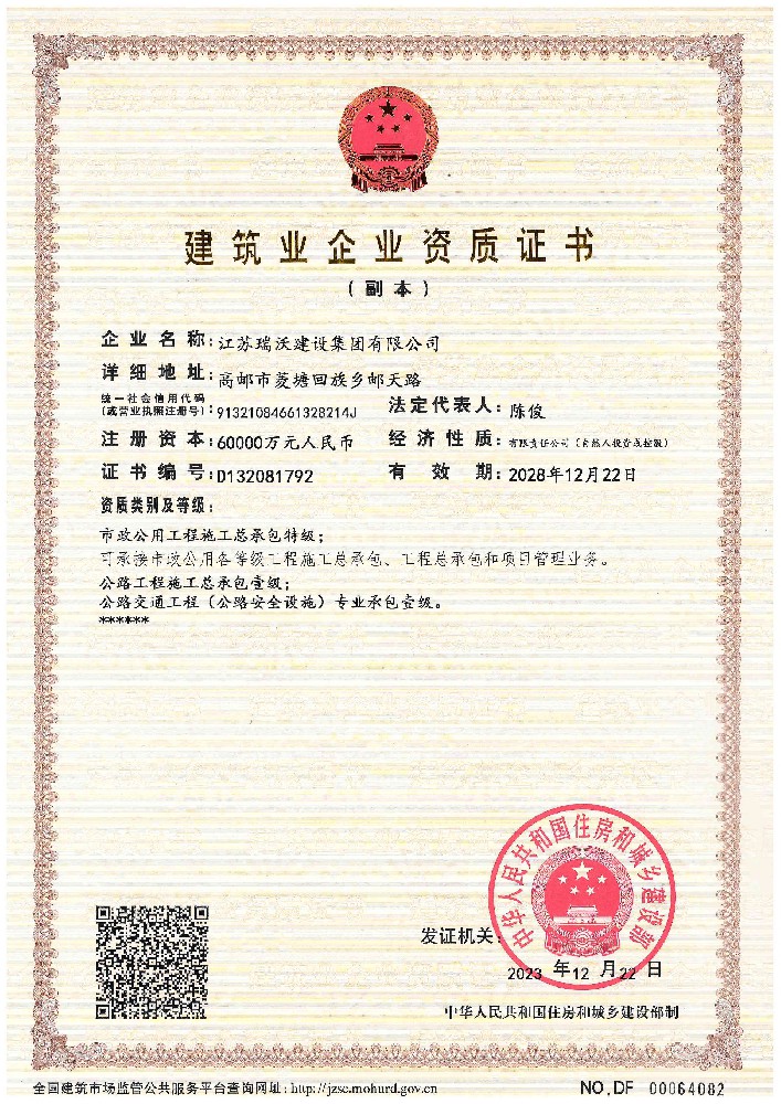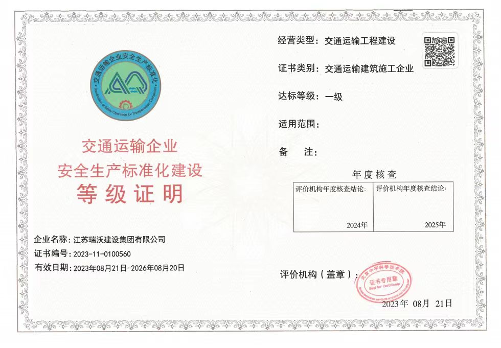 江蘇瑞沃建設集團有限公司成立于2007年,是一家以市政、交通工程建設為主導,集房屋建筑、交通安全設施、城市道路照明工程、電力工程、隧道工程、航道工程及投融資為一體的綜合性企業(yè)。企業(yè)注冊資本60000萬元,現(xiàn)有各類技術(shù)人員580人,其中中、高級以上人員498人,注冊類人員268人,一、二級建造師166人。公司榮獲“江蘇省建筑業(yè)優(yōu)秀企業(yè)”、“江蘇省五一勞動獎狀”,連續(xù)多年被評為“揚州市先進企業(yè)”、“江蘇省建筑業(yè)百強企業(yè)”,連續(xù)八年蟬聯(lián)百強企業(yè)基礎(chǔ)設施類第一名。